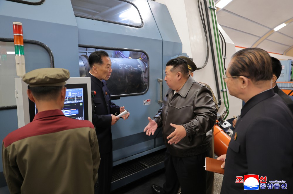 Товарищ Ким Чен Ын осмотрел разные места комбината по производству снарядов, где конкретно ознакомился с положением производства и работ по наращиванию производственных мощностей и модернизации.