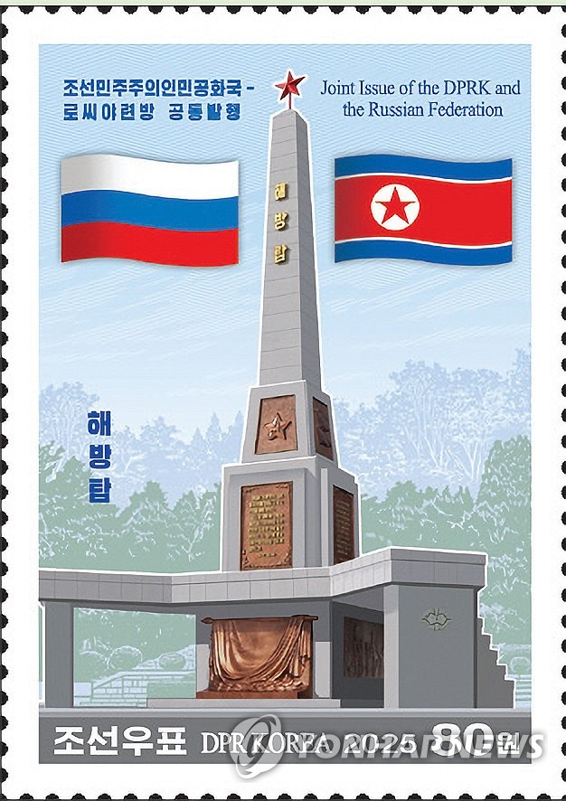 Указывается, что марки будут изданы 15 августа – в день годовщины. На них изображен Монумент Освобождения, который часто посещают российские делегации при визите в Пхеньян. На марках также есть надпись “Совместный выпуск КНДР и России”.